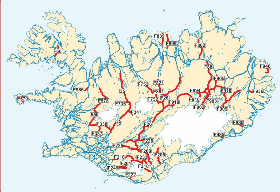 This is a map showing the F-numbers of Icelandic mountaintracks and roads.